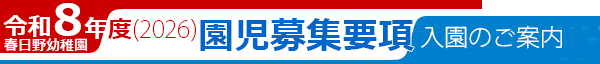 春日野幼稚園では創立以来の伝統を踏まえ初心を忘れずに、自然との触れあいや人とのふれあいを通して、豊かな感性と社会性を育み、日々幼稚園生活が楽しく、生き生きと過ごせるように幼児教育に取り組んでおります。 家庭から集団生活の第一歩を踏み出す幼児期こそ、生涯の人格形成に最も大切な時期だと考え、“保育は人なり”をモットーに先生の愛情により、先生大好き、幼稚園大好きと、人への愛情、信頼感を育て、優しく思いやりのある子どもが育つように幼稚園としての役割を果たしてまいります。 ![]() 入園願書受付・面接 11月1日(土) 9:30~11:30の間に行ないます。 (1)入園案内配布時にお知らせした時刻に保護者同伴にてご来園ください。 (※入園申込書をご持参ください。) (2)お子様を理解するために面接を行ないます。 ※ 園児募集要項の詳細はこちらをご覧ください |